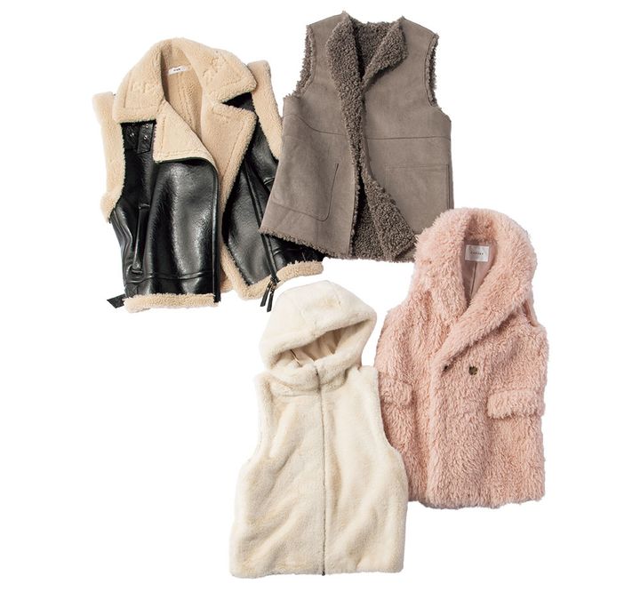 <上右>リバーシブル仕様で楽しさ2倍。ムートンジレ¥25,300(HER.)<上左>レザー素材ももこもこ合わせなら脱ハードに。ボアコンビレザージレ¥75,900(ヴェニット/ハルミ ショールーム)<した右>ふわふわ×ピンクが大人可愛い。¥38,500(カデュネ)<下左>頑張らない日のオシャレにも。¥25,300(アルページュストーリー)