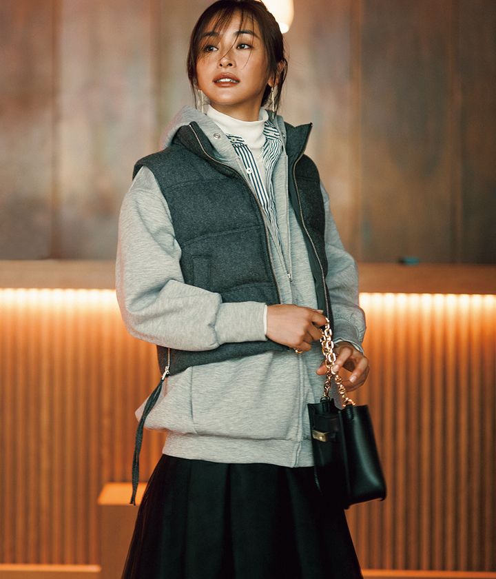ダウンジレ¥26,400(メゾンスペシャル/メゾンスペシャル 青山店)パーカ¥19,800(ジル スチュアート)シャツ¥31,900(ティッカ)カットソー¥9,900(アンクレイヴ スタンダード/オンワード樫山)スカート¥77,000(SHE Tokyo/エスティーム)バッグ¥11,900(CHARLES & KEITH)ロングブーツ¥132,000(ネブローニ)ピアス¥102,300(マリハ)ネックレス¥12,100(Pearl for Life/ロードス)