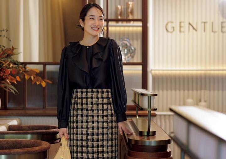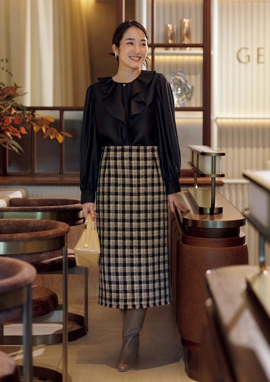 華チェックのツイードを味方にパンチが効いたエレガンスを