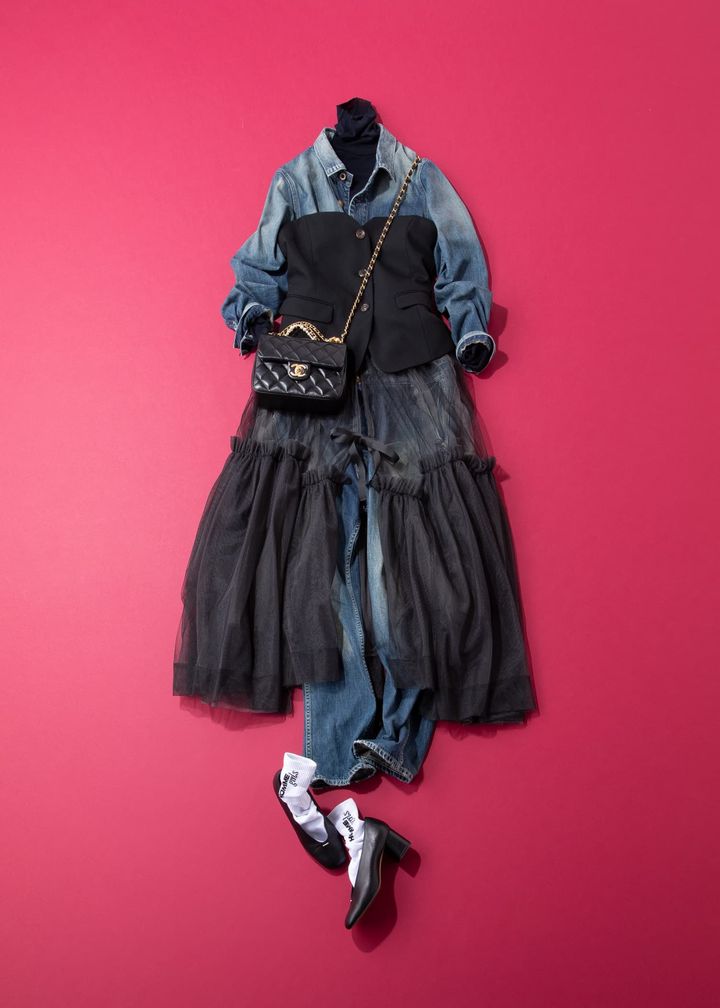 親しい女友達と集まる夜は、自分らしさをベースにいつもより少しだけ華やかをプラス。デニムのオールインワンにビスチェとチュールスカートを重ねてイベント仕様に。シャネルのバッグは海外スナップを見て一目惚れ。日本に入ってきたタイミングでお迎えしました。普段はシルバー派の私ですが、ゴールドチェーンにパールのデザインがお気に入りです。