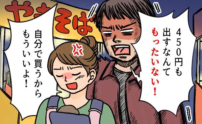 しかし、夫は間髪入れずに「450円も出すなんて、もったいない!」と言い放ちます。そんな夫の言葉に「自分で買うからもういいよ!」と、子どもを連れて出店へ。夫も友人の態度に腹を立て「勝手にしろ!」と黙り込んでしまいました。