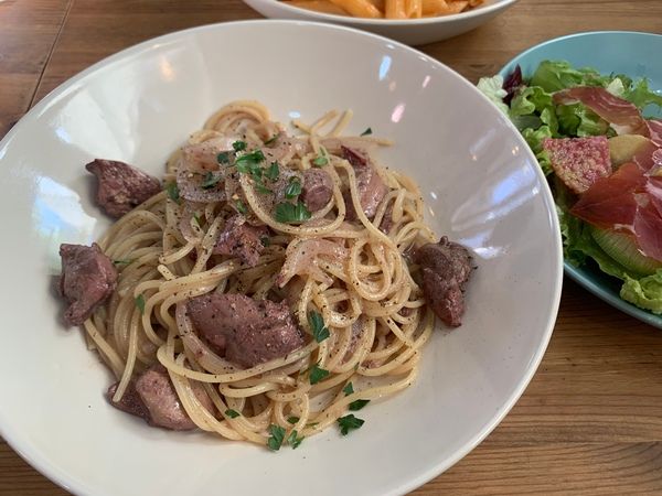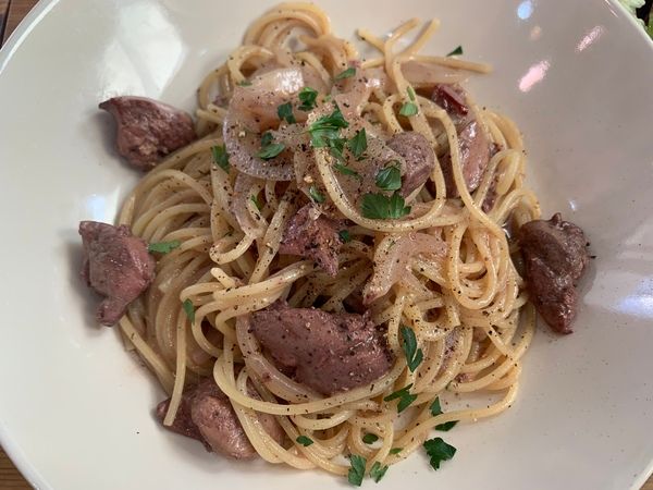 こちらは私の鶏レバーと玉ねぎのオイルソースパスタです。