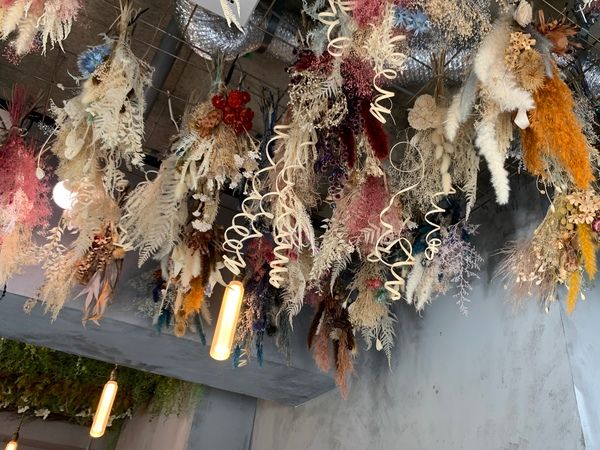 天井を手前側と奥側に真ん中辺りで仕切って、手前は色とりどりの華やかなドライフラワー、奥側はグリーンとゾーニングされていました。他のお客様がいらしたので撮れませんでしたが、置かれているインテリアなどもとても素敵で、入っただけで気分が上がってしまいました!