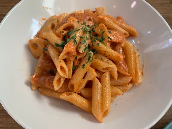 チョリソーとレンコンのトマトクリームソース ショートパスタ