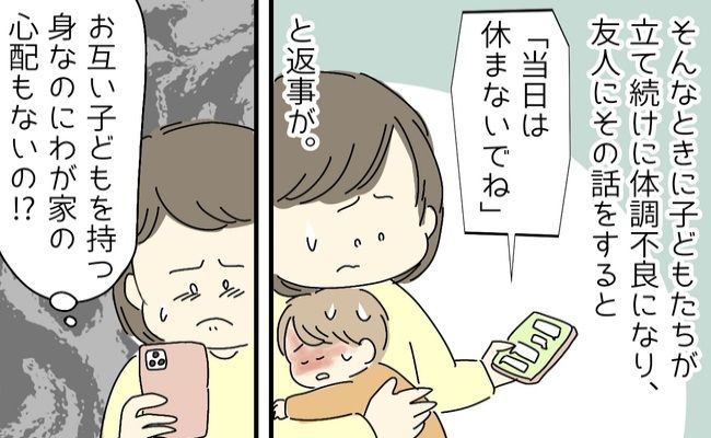 そんなとき、結婚する友人から余興の進捗状況を確認するメールが送られてきます。子どもが体調を崩していて、看病していると説明すると「当日は休まないようにね」とまさかの返信。友人はすでに子どもがいましたが、同じママとして子どもの体調不良の大変さや、わが家の心配をしてくれないことにモヤモヤした気持ちが残りました。