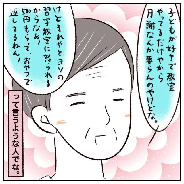 お母さんによると、鼻山さんは「子どもが好きで教室やってるだけやから月謝なんか要らんのやけどな。けどそれやとヨソの習字教室に怒られるからなぁ!500円もらって、おやつで返してるねん!」と言うような人柄のよい人でした。