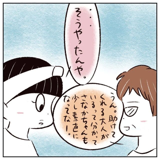 お母さんの話を聞いて「・・・そうやったんや」と呟いたまるさん。お母さんは「うん。助けてくれる大人がいるって分かってさなかちゃんも少し素直になってなー」とさなかちゃんの変化を話します。