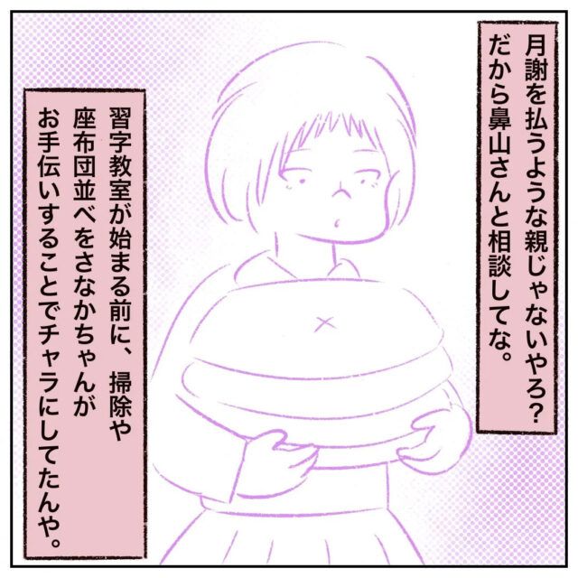 さなかちゃんの両親は月謝を払うような親じゃないと考えたまるさんのお母さんと鼻山さんは相談し、習字教室が始まる前に掃除や座布団並べをさなかちゃんがお手伝いをすることで月謝をチャラにしてたといいます。