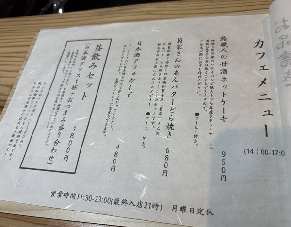 カフェーメニューが! ぜひ、「鮨職人の甘酒ホットケーキ」を試してみてください。 もちろん、日本酒のお店なので「昼飲みセット」を楽しんでも。