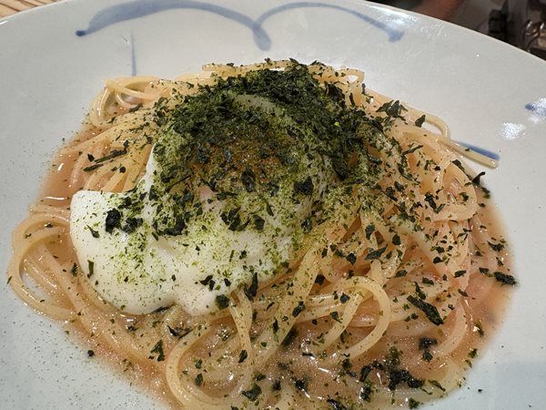 相方は、ご主人の一押し「あおさと明太子の月見パスタ」。 私も食べたことがありますが、明太子パスタの概念が崩れるような おいしいパスタです!