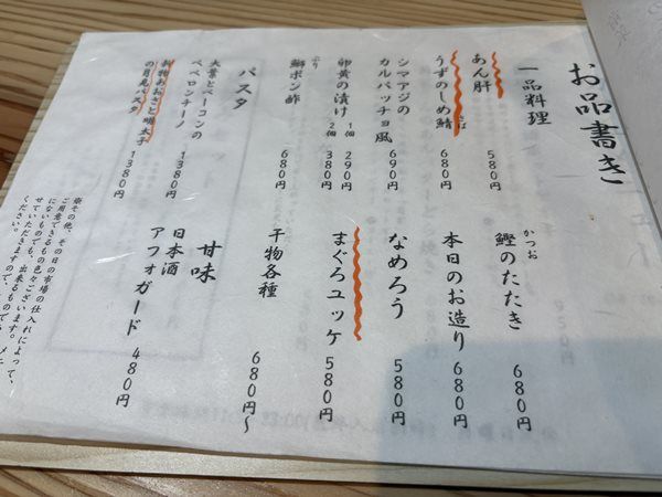 一品料理も頼めます。 相方はこちらから、鰤ポン酢と「本日のお造り」、あおさと明太子の月見パスタを選択。