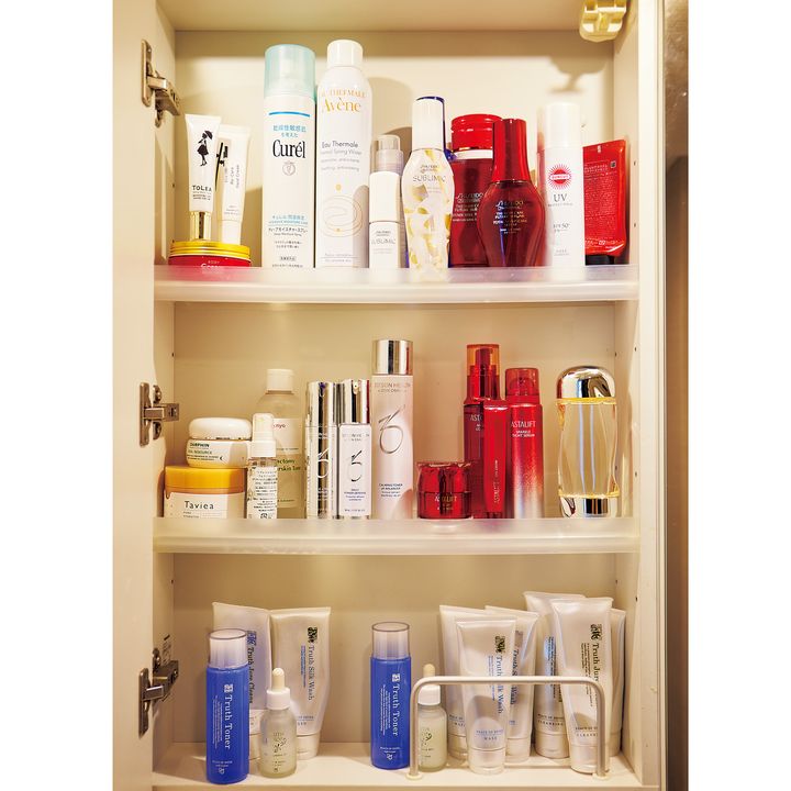 毎日使うPEACE OF SHINEのスキンケアラインは一番下段の右に置き、ゼオスキンなどのドクターズ系は肌の調子がいい時に使用。ブランドや頻度別に並べ、一目で分かるように。