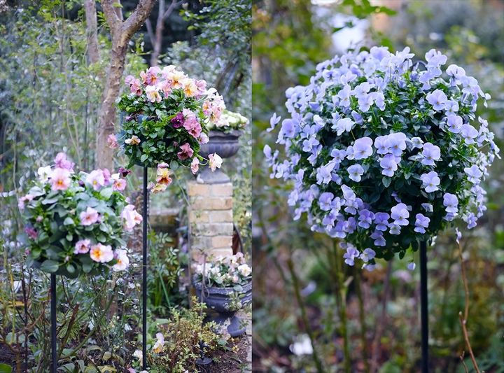 パンジー&ビオラのハンギングバスケットが連続し、バラのスタンダード仕立てのようなフォーマルな雰囲気も新鮮。