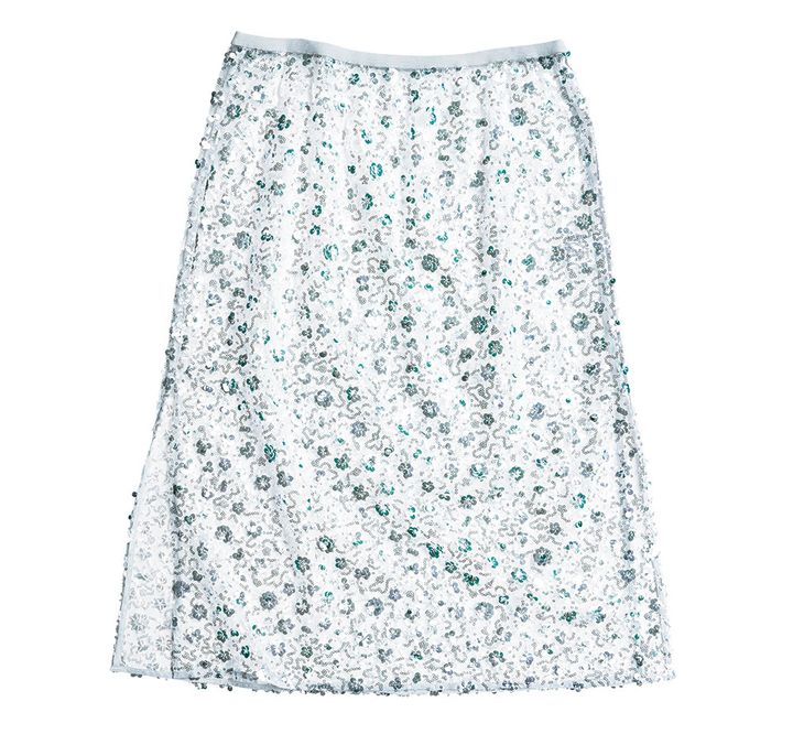 インパクトのあるアイテムも手持ちのベーシックなアイテムと合わせることでコーデが馴染むので、【1点盛り】がMYルール。地味色の流行りモノなら、浮かずにコーデ全体に品よく溶け込みます。シアースカートは着慣れたコーデに+1で、華やかさMAXの装いにアップデート。いつものパンツスタイルにレイヤードするだけでコーデの鮮度が劇的アップします。(スタイリスト・井関かおりさん)