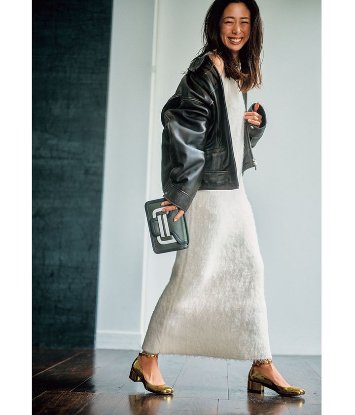 流行り物一点投入で、オシャレを楽しみます。最旬おじブルゾンは、甘ニットワンピのハズし役に最適! ニットワンピとおじジャケットのギャップがオシャレを活性化。ニットワンピが甘い分、着崩してもキレイをキープできるから、冒険アイテムにも手が届く。(スタイリスト・井関かおりさん)