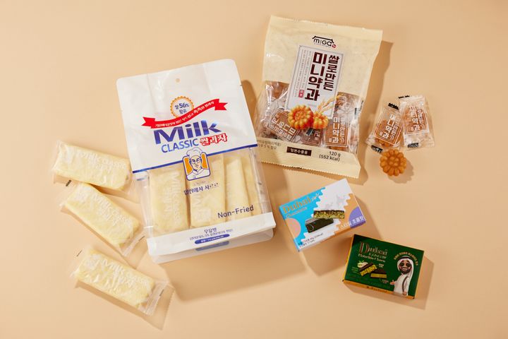 左・軽い食感とどこか懐かしくて優しい甘さの味わいが一度食べたら病みつきになるミルク味の米菓子。右上・韓国のドラマやYouTubeで登場したことで日本での認知度がアップした花の形をした韓国の伝統的なお菓子。シナモンの香りともっちりとした甘さが特徴。右下・板チョコの中にピスタチオのスプレットとトウモロコシの粉から作った乾麺「カダイフ」が入ったサクサクの食感が韓国で爆発的に人気の中東発のチョコレート。