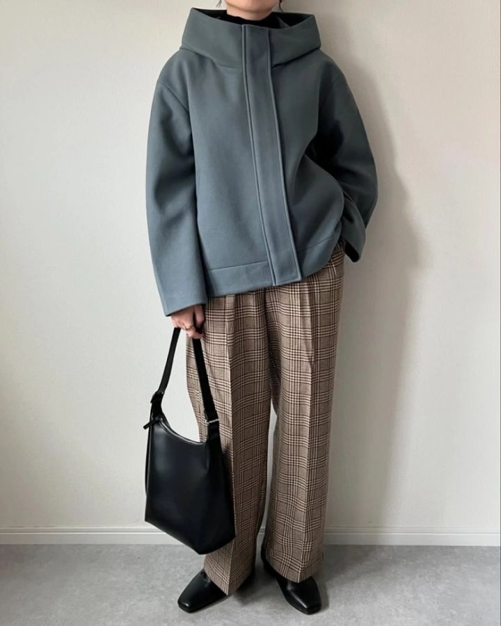 コージーメルトンショートフーディコートの袖は肩の形に沿うよう考えて作られていて、きれいなシルエットなのが特徴。チェックのワイドパンツを合わせると、クラシカルで大人っぽい印象になりますね♡コートの前を閉めて着ると、さらにきちんと感のある落ち着いたコーデに。ブルー×ブラウンの組み合わせもこなれ感があっておしゃれです!