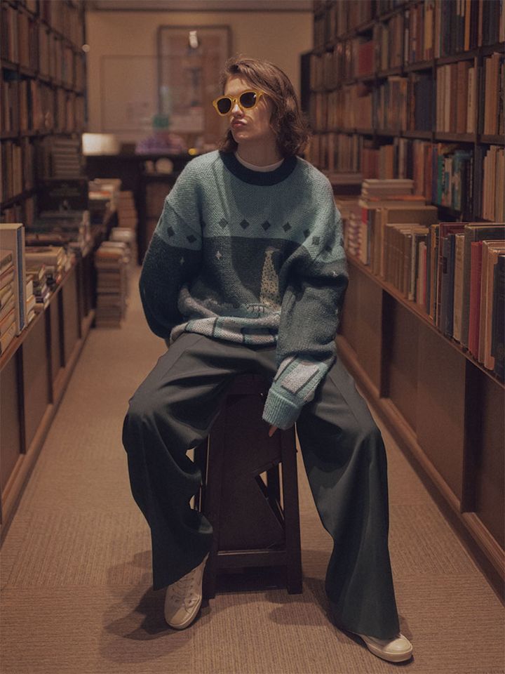 【POINT】センタープレス入りのきちんとしたスラックスは、フォトプリントを編みこんだようなデザインニットでも子供っぽく見せないキレを発揮。上下くすんだ配色でまとめることで、ルーズ+ルーズなシルエットもさまになるエフォートレスな仕上がり。