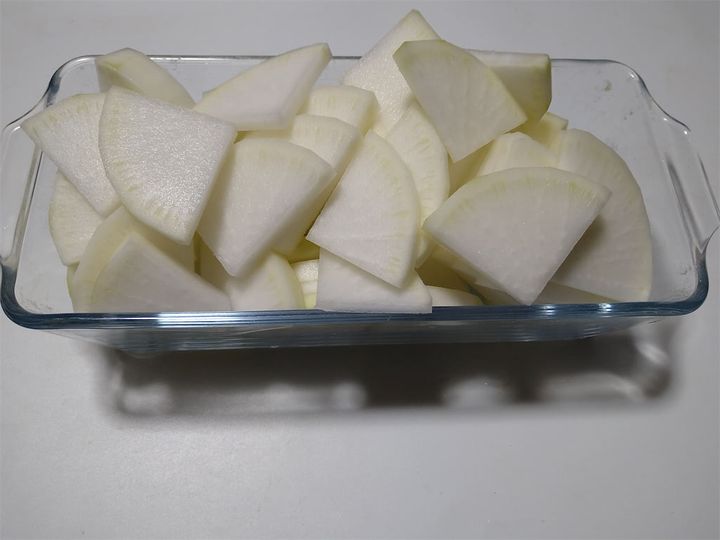 1.大根は皮を剥き、2cm幅のいちょう切りにする。耐熱容器に入れてラップをかけたら、600Wの電子レンジで7分加熱する。