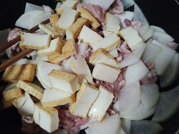 4.そこに切った厚揚げを加えて全体的に火が通ったら、めんつゆ、水、おろししょうがを加える。落としブタをして、弱火で10分煮込んだら完成。