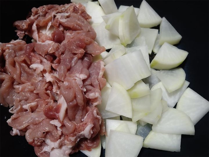 3.フライパンにゴマ油を引いて熱したら、切った大根と豚肉を入れてさっと炒める。