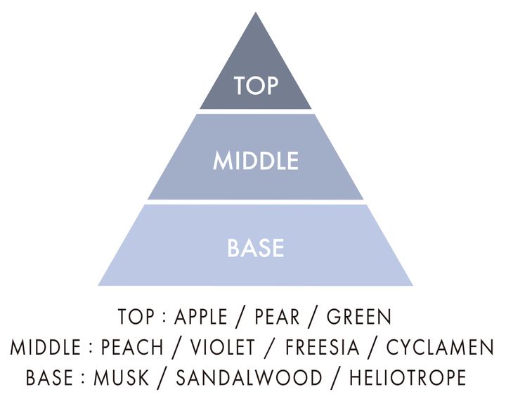 ホワイトムスクの奥深く透明感あふれる印象はしっかりと残しながら、アップルとペアが奏でる優しいフルーティーノートから始まり、ほのかに香るグリーンがエッセンスに。