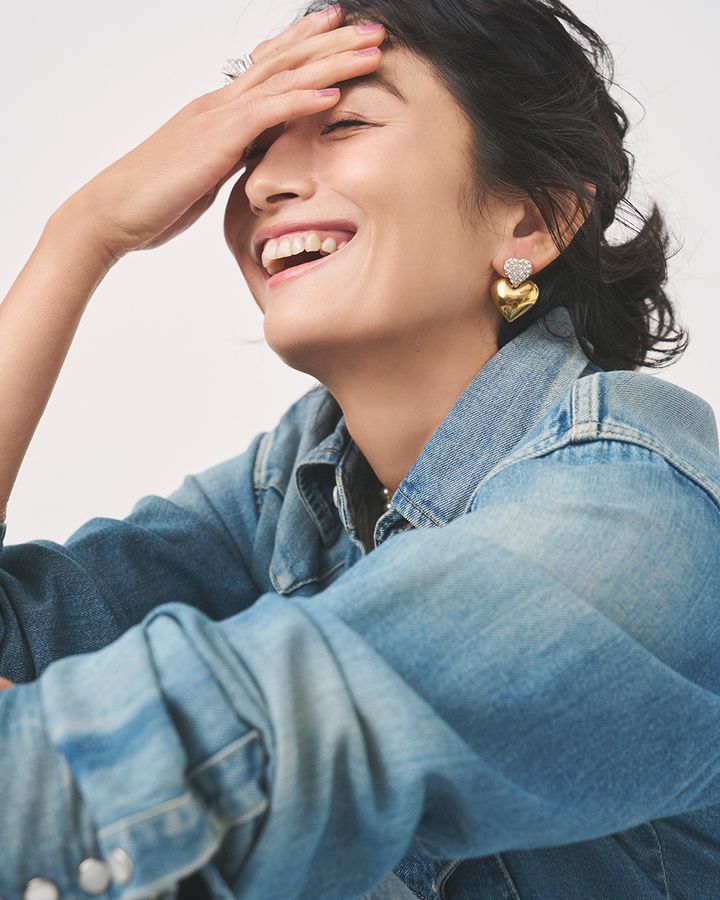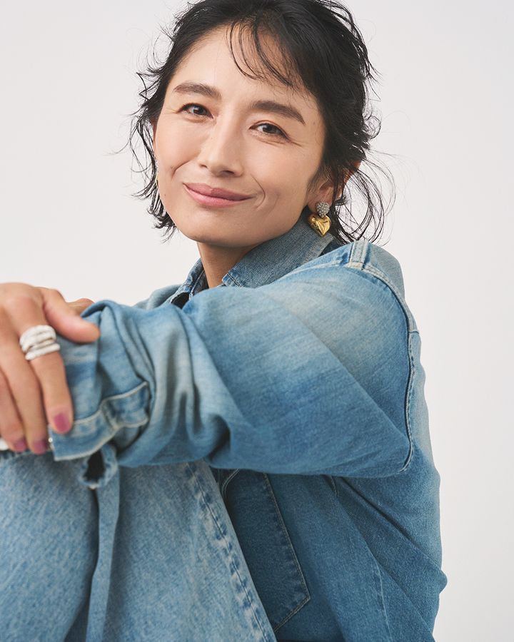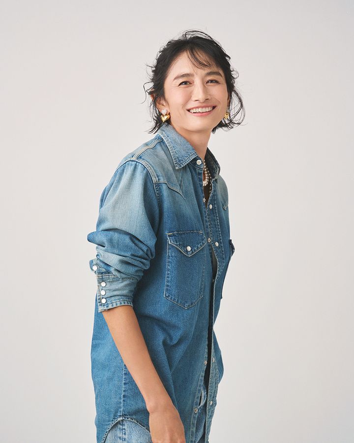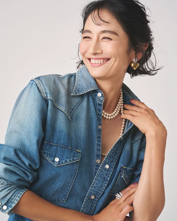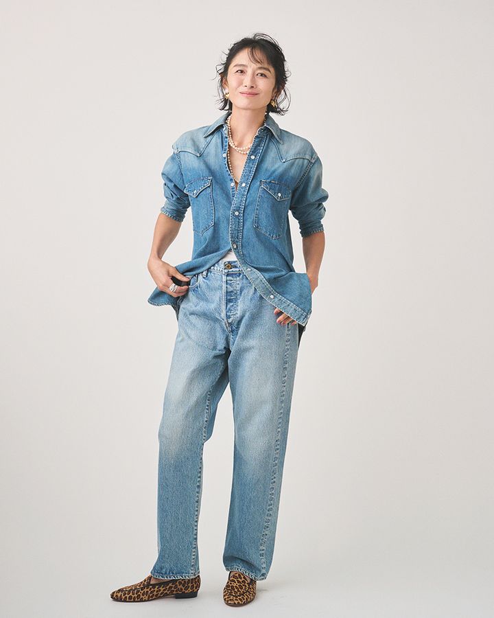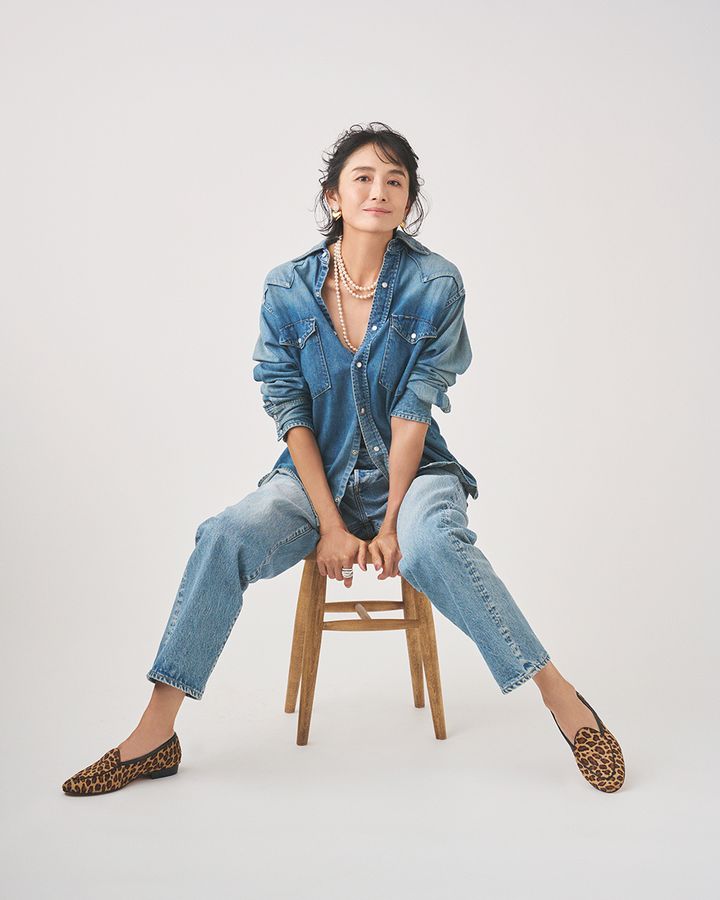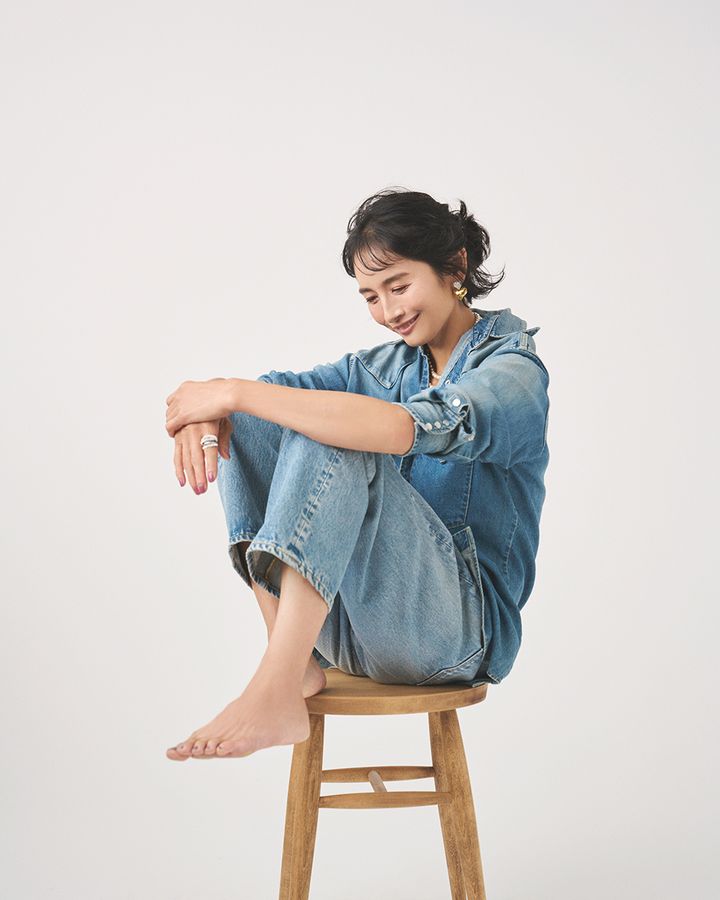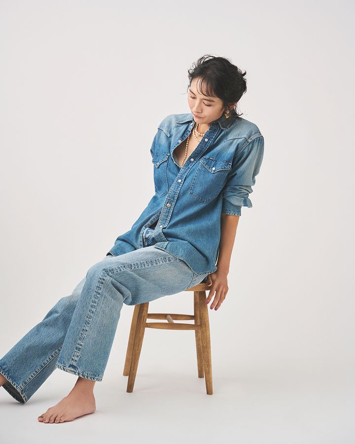 デニムシャツ¥55,000、デニムパンツ¥53,900(ともにマディソンブルー)ネックレス¥15,750、イヤリング¥32,400、リング¥13,200(すべてアビステ)