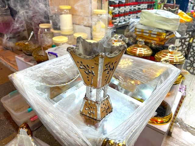 実は高価なもので、お手頃に買えるのがアラブ諸国の魅力。せっかく訪れたらぜひ試してみましょう。なぜ街でよく見かけるのかというと、お客様を招き入れたりする際に使用したり、エチケットとして使用されるからです。日本でよく見るお香と異なるのが、香炭に火をつけて木を置く形です。日本と違って煙の量が凄まじいので、室内で使用する際は火災報知器に気をつけましょう。筆者はコンパクトな香炉と香木、香炭のセットを値切って800円で購入しました。