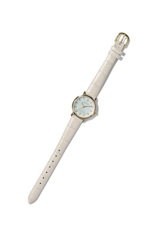 クリーンなオールホワイトに白蝶具×マットゴールドのベゼルがポイント。シンプルな白レザーは甘めコーデにも相性抜群。
