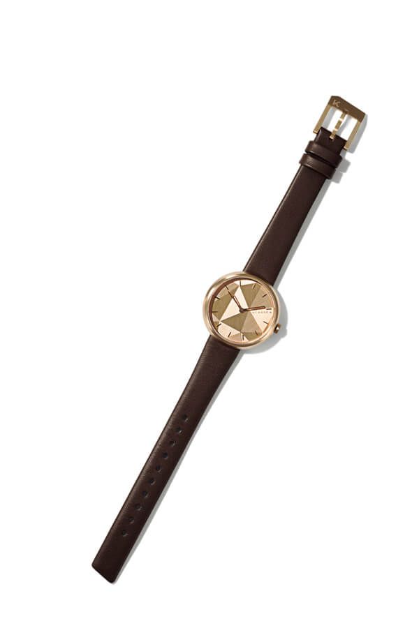 立体加工の文字盤がモダンでスタイリッシュ。角度によって輝きを変える文字盤が主張しつつ、ブラウンのレザーで落ち着いた印象に。
