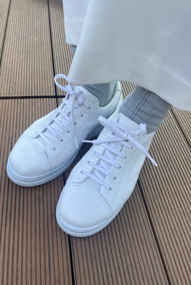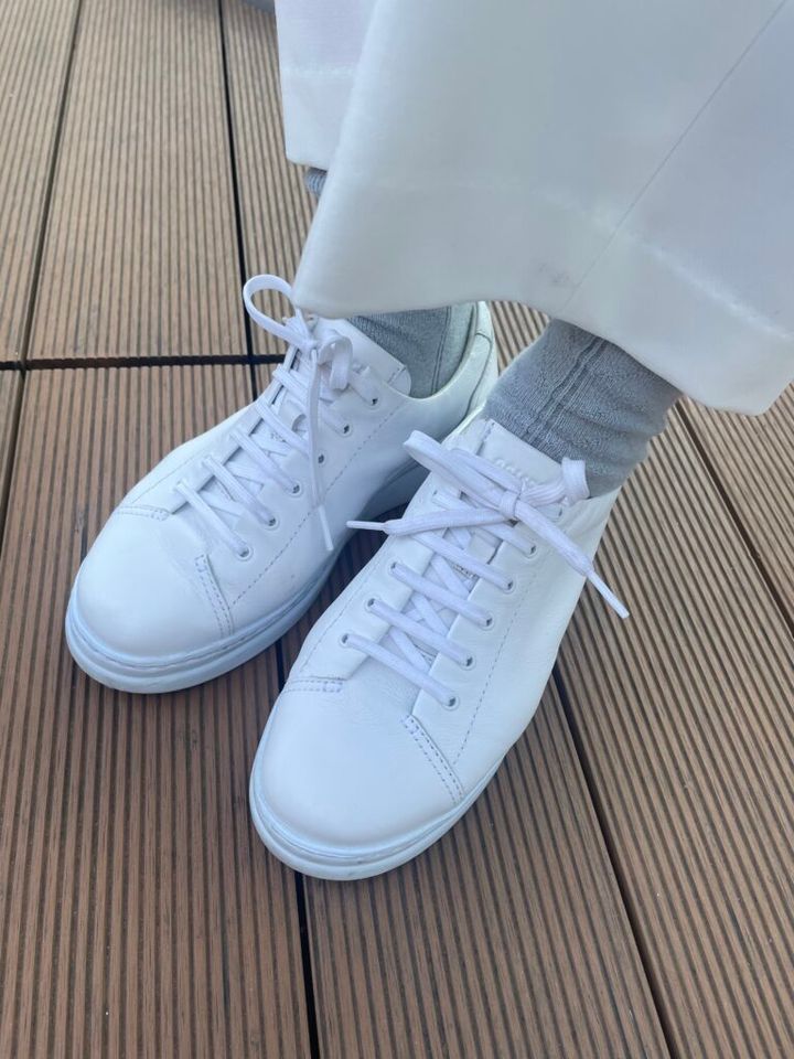 「白のスニーカーは『カンペール』。コーディネートをさわやかにまとめてくれるので一年中使いやすく、出番が多い一足!足元までしっかり清潔感を重視しています」