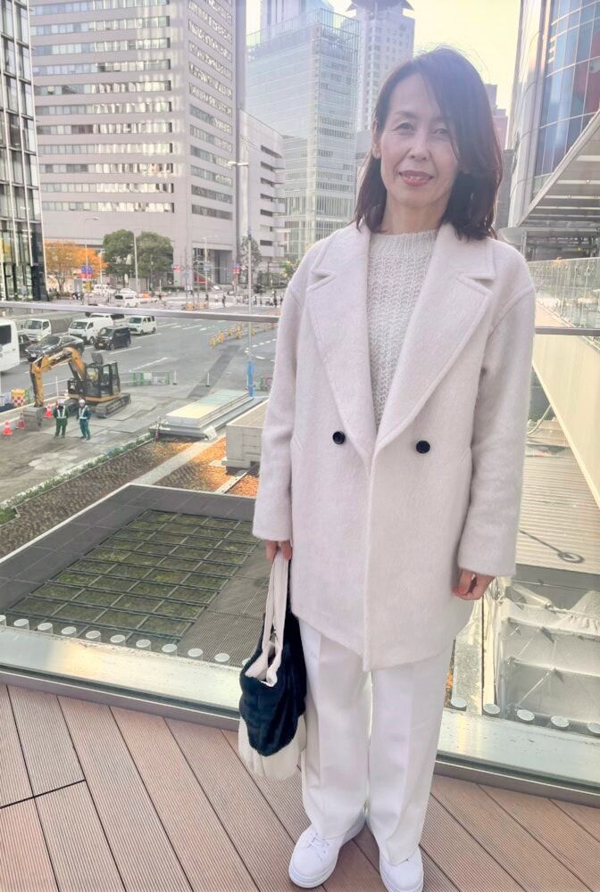 【60代スナップ】スタイルアップできる「ユニクロ」パンツ×「BABYLONE」ラメニットで、真冬にも爽やかなオールホワイトコーデが完成!