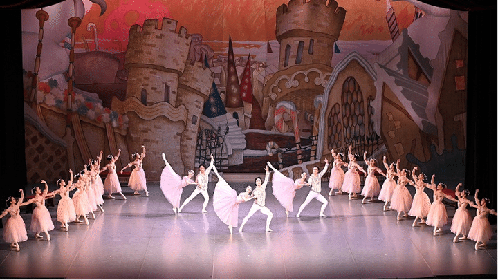 お菓子の国のセットを背景に、カラフルな衣装に身を包んだお菓子の精たちが舞います。
