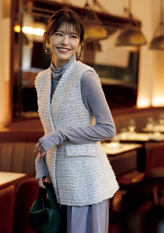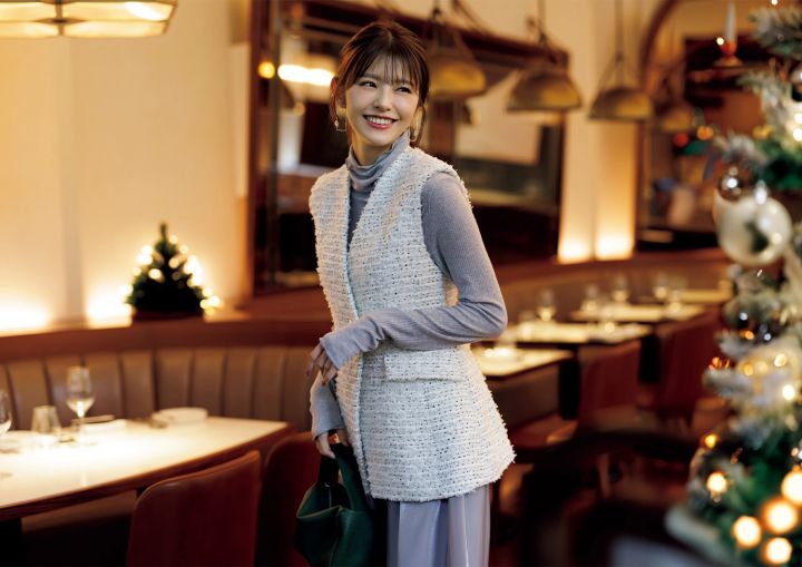 起毛感のあるツイードジレでリュクスなムードを盛り上げて