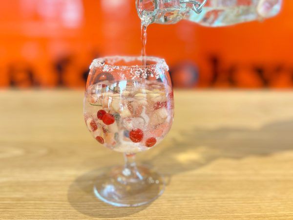 青りんごのソーダを注いでいくと...キラキラと輝くゼリーやフルーツが舞い、まるでスノードームのよう。
