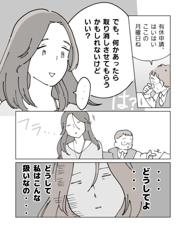 早速上司に申請すると、「有休申請、はいはい、ここの月曜日ね」そう言った後で、「でも、何かあったら取り消しさせてもらうかもしれないけどいい?」と聞かれ亜美さんは無言に。自席に戻りながら「・・どうしてよ・・どうして私はこんな扱いなの・・」とやりきれない想いに駆られてしまいました。