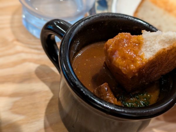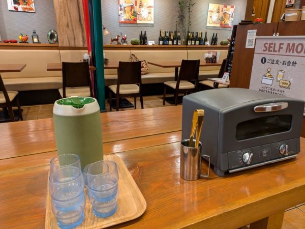 今回は「牛タンシチュー 小サイズ」を注文しました。レジで注文し受け取ったら、お冷の用意やパンをトーストするのは自分で行うという、セルフタイプです。