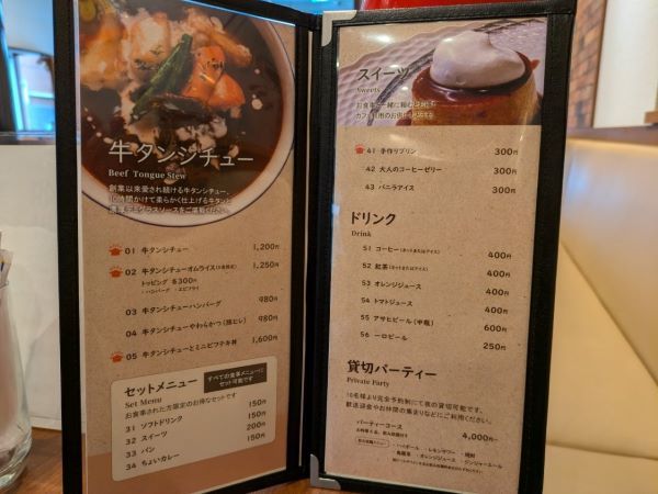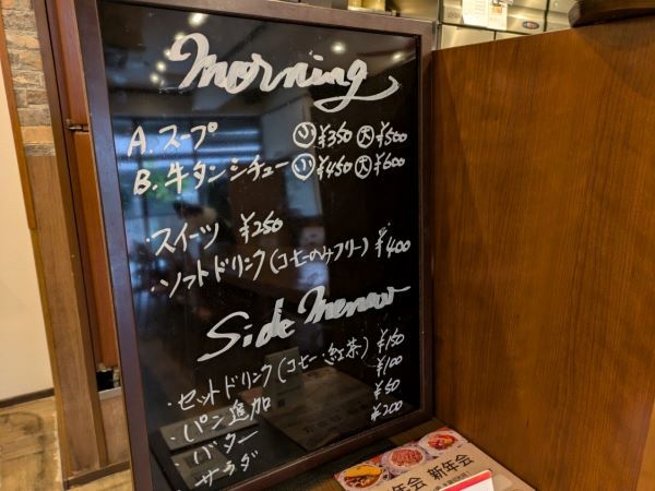モーニングメニューは2種類あり、Ⓐは日替わりのスープで、小サイズが350円、大サイズが500円、Ⓑは牛タンシチューで、小サイズが450円、大サイズが600円です。この立地、このメニューで殆どが500円未満とはとてもリーズナブルだと嬉しくなりますが、さらに驚くことには!このモーニングのどれを選んでも、無料のパンが付くというんです! サイドメニューのコーヒー・紅茶(150円)、パン追加(100円)、バター(50円)、サラダ(200円)も、リーズナブルな価格帯です。