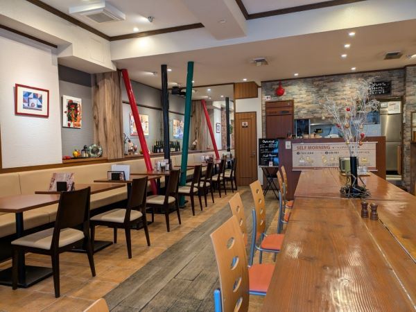 広々とした店内で、カントリー調の色合いが温かみのある店内です。中央は大きめのテーブル席、壁際は2人用のテーブルが並んでいるので、1人でも複数人でも利用しやすいですよ。
