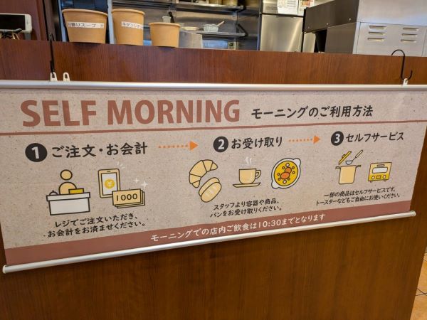 健康診断で朝食抜きだった私の目に入ってきたこの看板!「朝ごはん、食べてこっ!」の問いかけに、大きく頷いて店内へ。