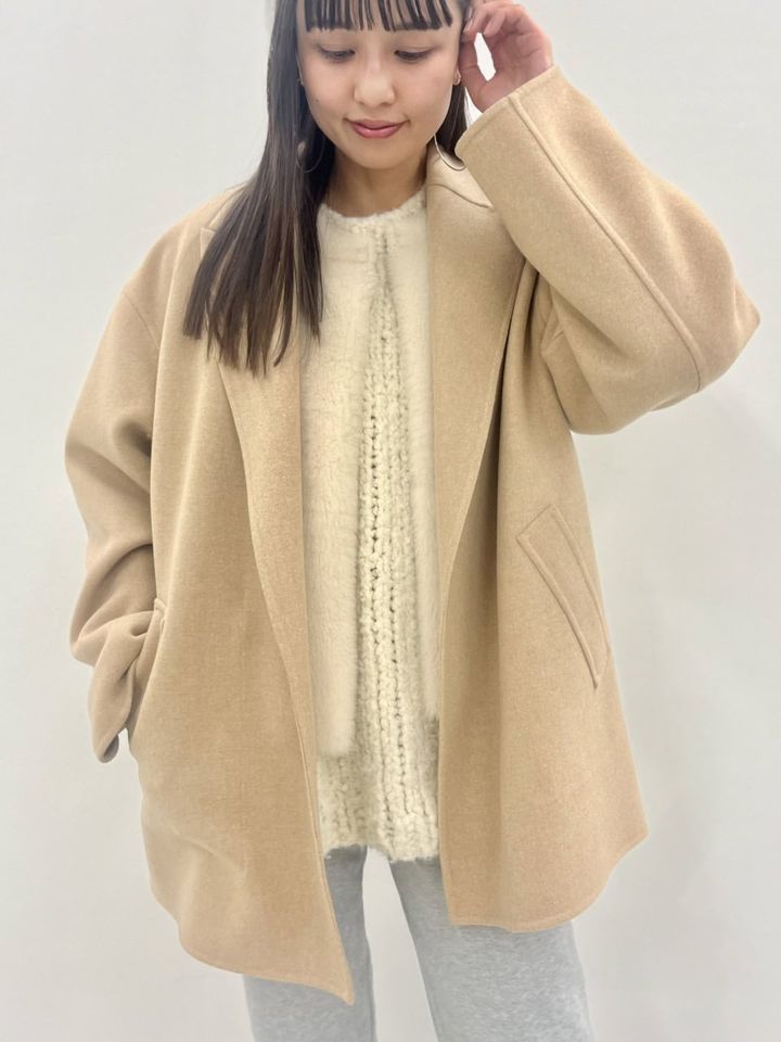 「ジャケットコートにムートンジレをレイヤードして、コーディネートに立体感がでるように意識しました。ポステレガントのジャケットコートはボタンがなくガウンのようにラフに着られるので、スエットパンツにスニーカーというカジュアルな装いにもマッチしやすくお気に入りです。柔らかな素材感と優しい色合いを引き立てるため、大ぶりのシルバーピアスとブラックレザーのバッグで、スタイルにシャープなアクセントを加えました」