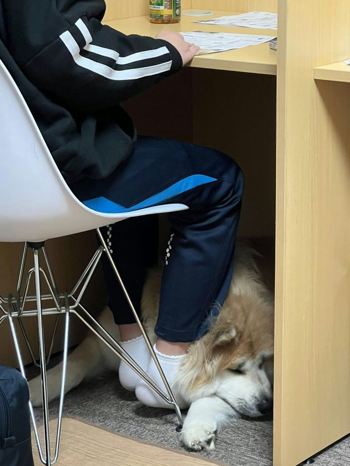 ペットと暮らしている人は、飼い主が大変な時にペットが寄り添ってくれた、という経験を持つ人もいますよね。悲しい時や病気の時、そっとそばにいてくれたという話を耳にすることもあります。今回、投稿者の秋田犬の琥珀🐾永遠🐾希叶🐾🐾さんは、受験生の足元に寄り添う秋田犬の画像を投稿しました。