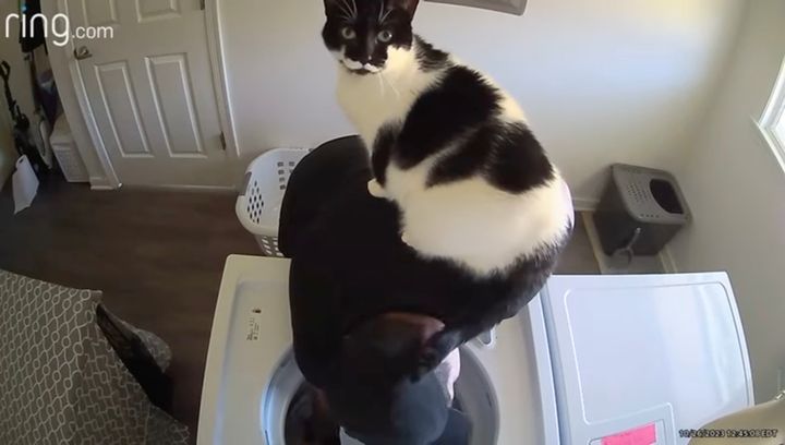 3. 洗濯をしている飼い主の背中に、飛び乗りカメラを見つめる猫