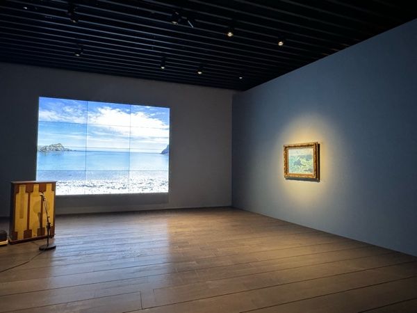 会場内に入ると前方には毛利氏が実際に訪れたフランス、ブルターニュ地方にあるベリール島の海岸の映像が映し出されています。会場内は波の音に加えピアノの音も聞こえてきます。