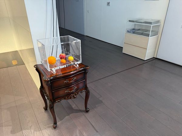会場入口の展示ケースのフルーツに刺さった電極から採った微電流が増幅され音に変換される作品《Decomposition》。(フルーツの水分量の変化を音と光に変換)会場入口でフルーツに繋がれたコードは会場内のライトに繋がっています。