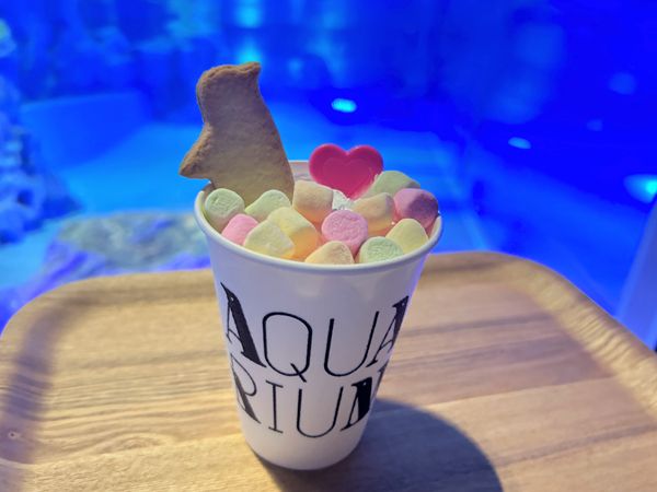 恋をしている、すみだ水族館のペンギンたちをイメージしたホットココア。カラフルマシュマロ、ペンギンクッキー、ハートのチョコレートなどのトッピングがキュートなドリンクです。