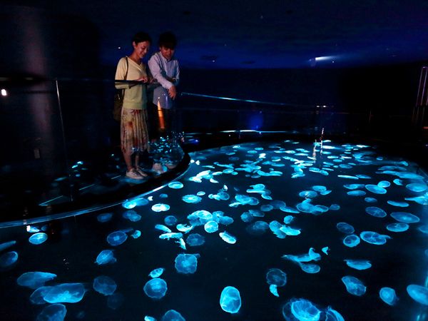 約14種類のクラゲを観察することのできる「クラゲエリア」では約500匹のミズクラゲが漂う、長径7メートルの楕円形の水盤水槽「ビッグシャーレ」が見もの!