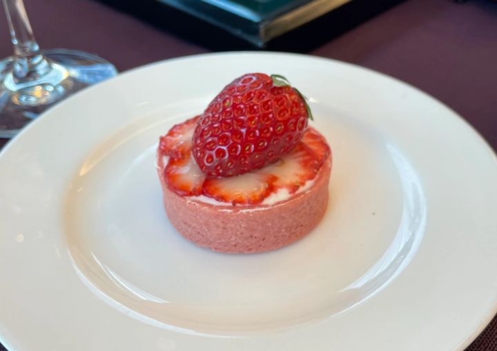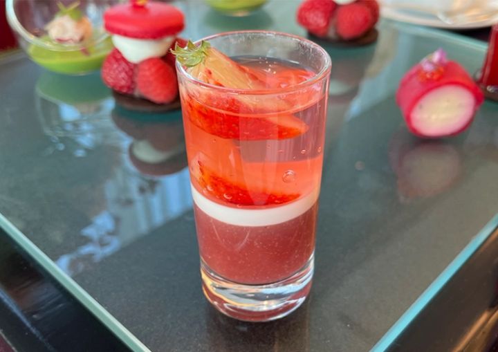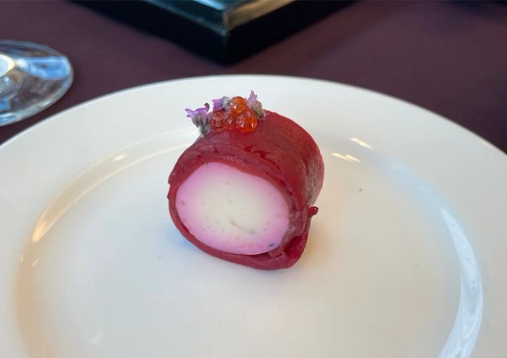 帆立とサーモンのムースをスモークサーモンで巻いた逸品。イチゴのスイーツとの世界観を合わせるため、スモークサーモンはビーツで真っ赤に染めたのだとか・・・!
