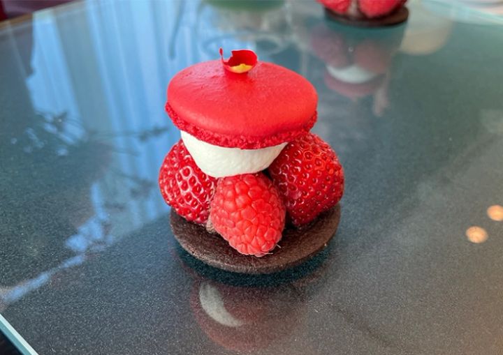 チョコレートガナッシュに〝あまおう〟やブルーベリーを添え、ホイップクリームとマカロンをオン!ジューシーなイチゴとサクッとしたマカロンの食感がトリコに。