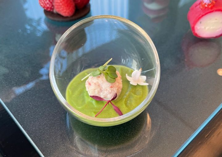 蟹のタルタルをトッピングしたブロッコリーのムース。舌触りがならめかで、春の訪れを感じるやさしい味わいにうっとり♪